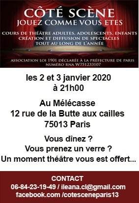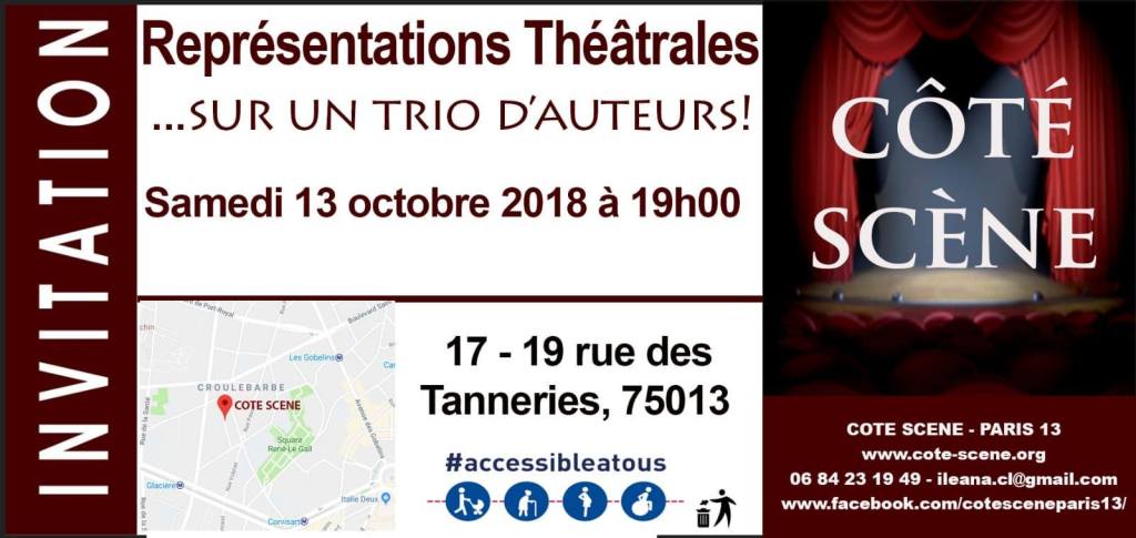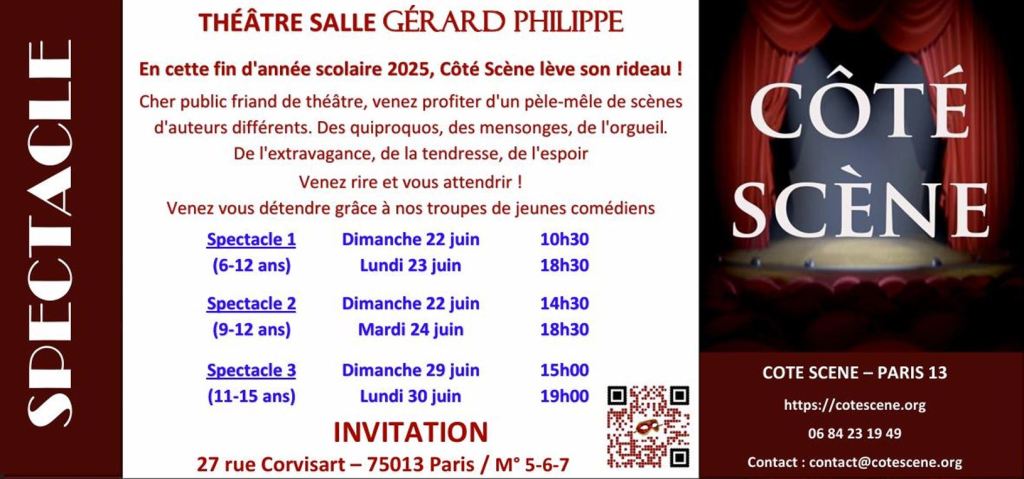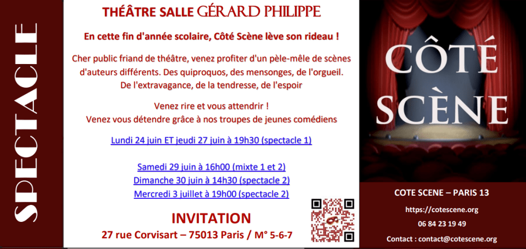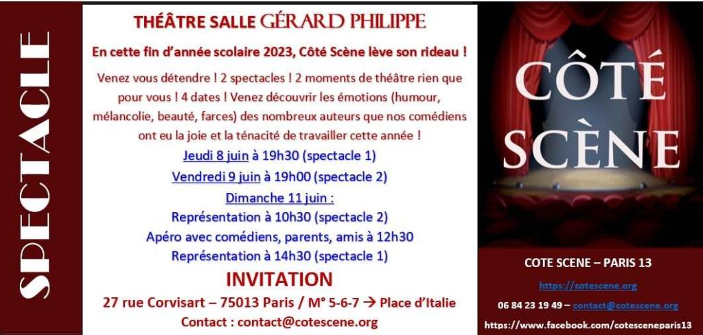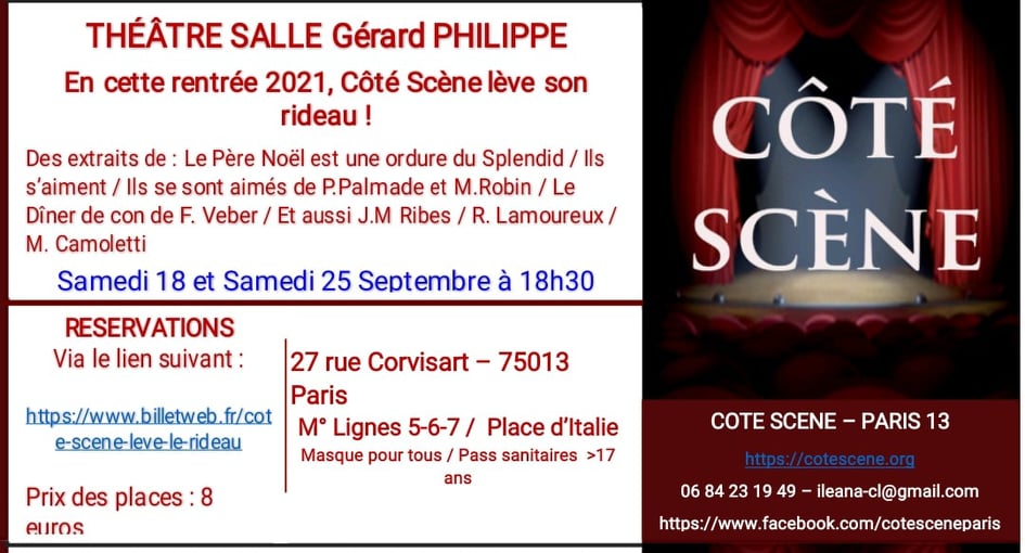 18-19-25 septembre 2021 : Une rentrée amusante avec un nouveau spectacle : un pèle-mêle de scènes de différents auteurs vous attend. Vous pouvez d’ores et déjà consulter les horaires et réserver vos places en cliquant sur le lien suivant : https://www.billetweb.fr/cote-scene-leve-le-rideau Nous serons très heureux de vous accueillir dans notre nouvelle salle de spectacle !