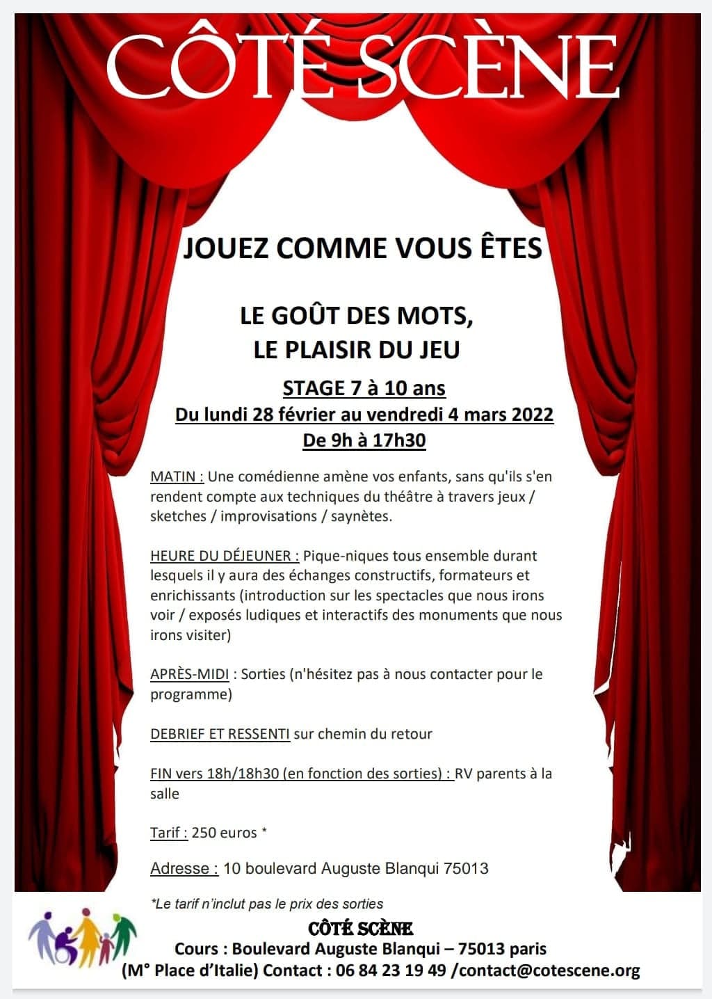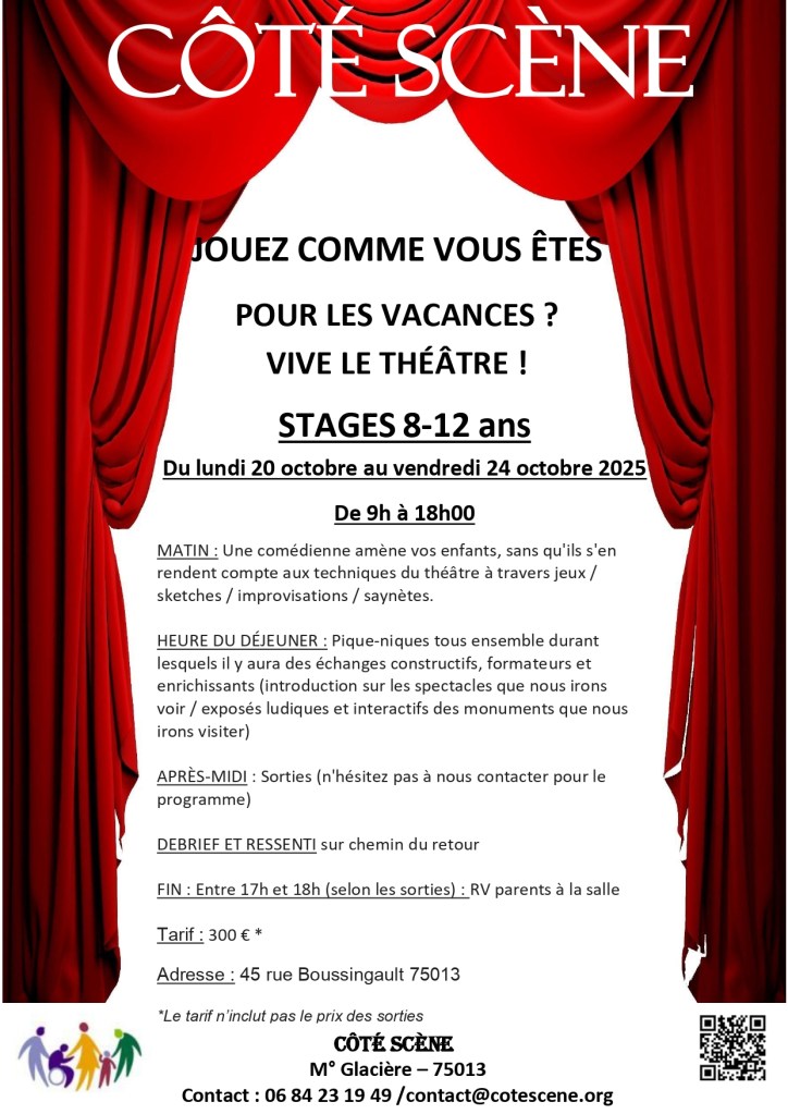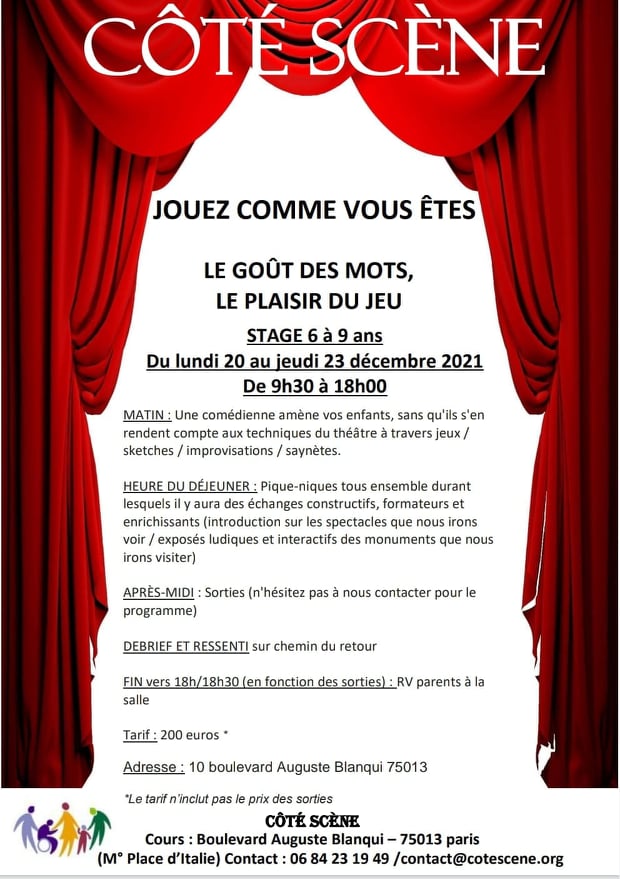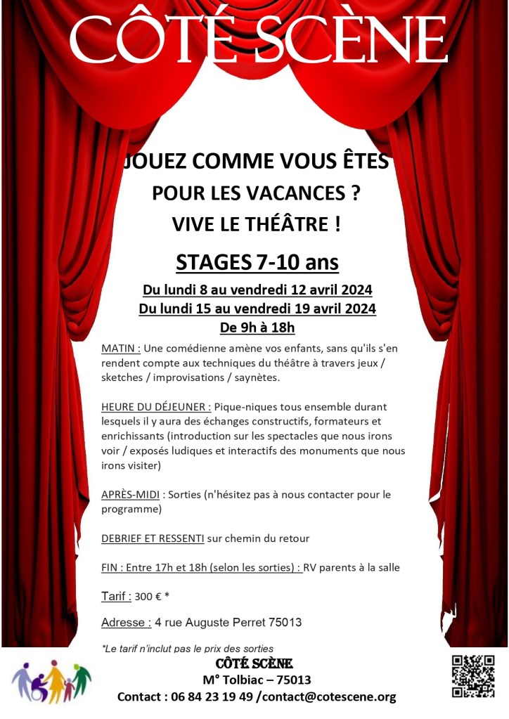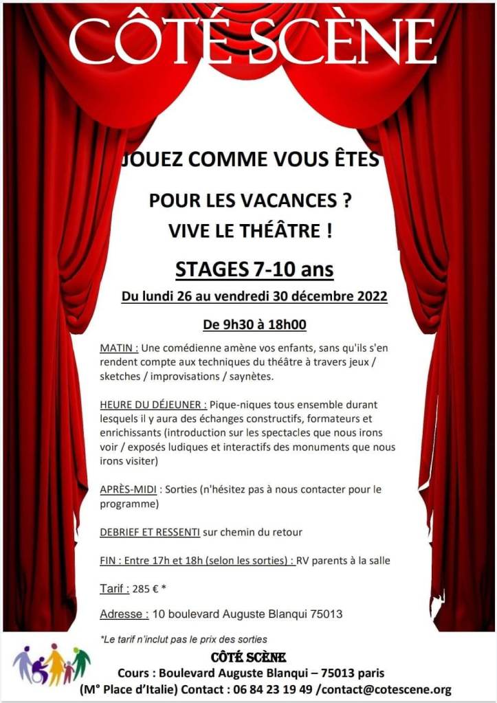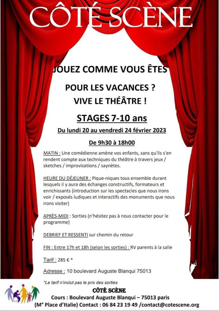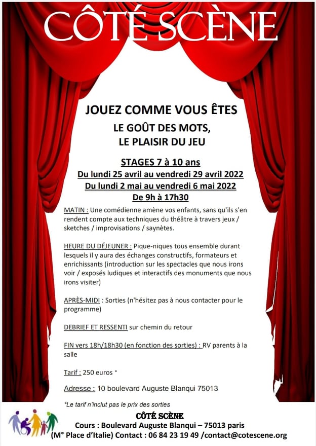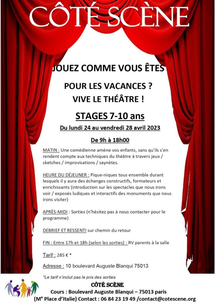 Ne vous inquiétez pas ! Côté Scène s’en charge en vous proposant ses stages tout en 1 !!!! > Occupation de 9h à 18h . Vous avez juste à fournir leur déjeuner et leur goûter et c’est parti pour une semaine de jeux / impros / travail sur les émotions pour les matinées théâtre et découvertes artistiques et culturelles pour les après-midis! N’hésitez pas à nous contacter pour de plus amples renseignements et si convaincus, alors pour une inscription. (Attention : nous ne surchargeons pas les groupes de façon à ce que le travail soit productif et l’interaction intéressante)
