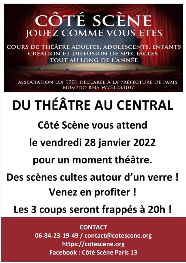Toujours septembre 2021 : Un théâtre en plein coeur du 13ème arrondissement ! Désormais pour ses spectacles, Côté Scène vous accueillera dans une magnifique salle pouvant accueillir agréablement et professionnellement 120 personnes.