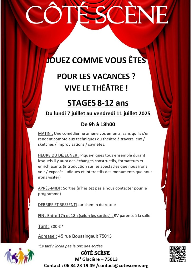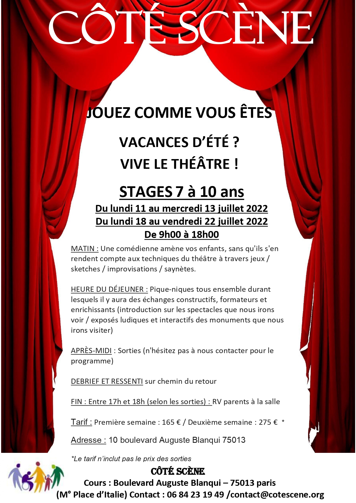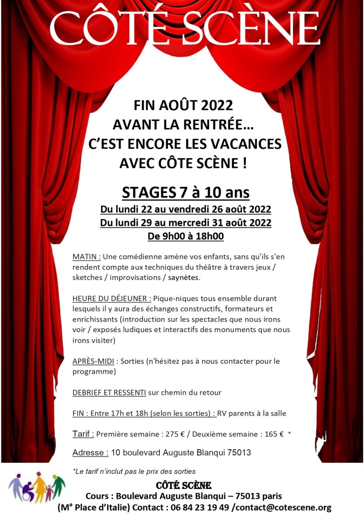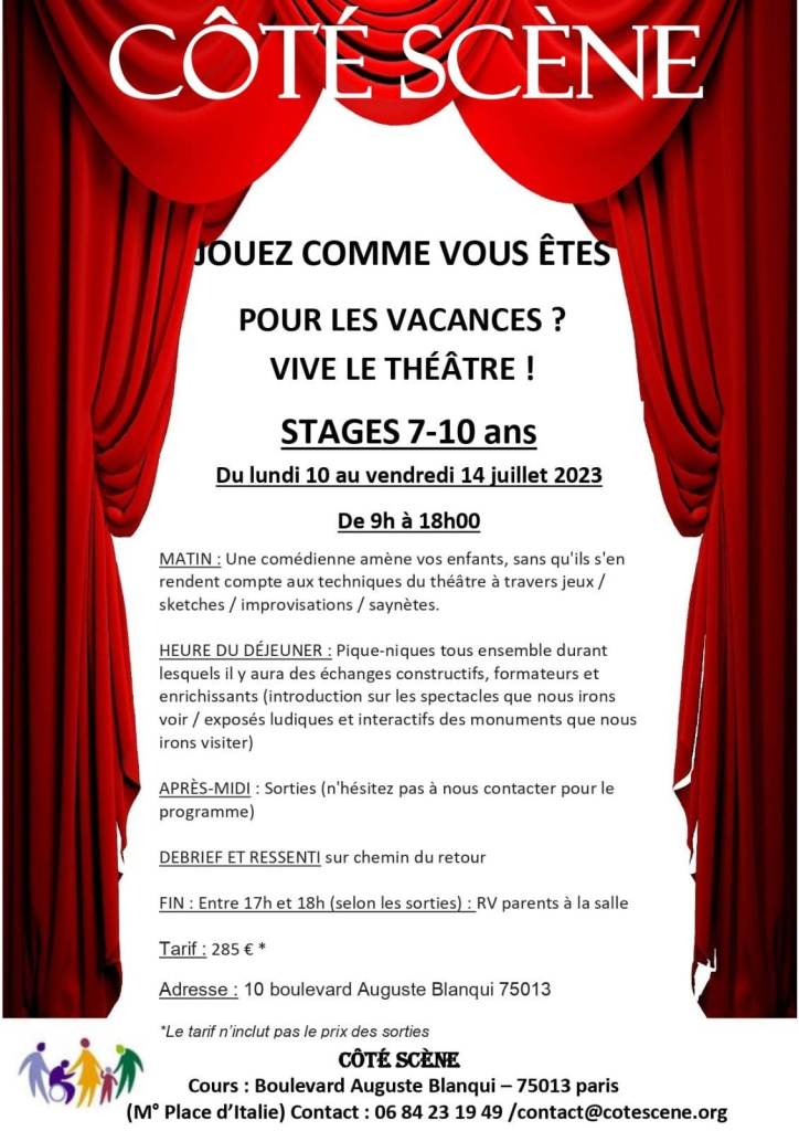 L’école est terminée……vive les vacances qui commencent avec Côté Scène : de la détente, du rire, des jeux d’impros, des découvertes grâce au théâtre , des balades dans Paris pour aller voir des spectacles et découvrir des monuments. La joie des enfants fait le réconfort des parents qui doivent continuer à aller travailler………ou fin août qui doivent reprendre le travail : les enfants n’ont pas envi d’aller au centre de loisirs avant même d’être retournés à l’école…..Côté Scène y a pensé et vous propose un prolongement des vacances pour vos enfants ! N’hésitez pas à nous contacter pour de plus amples renseignements !