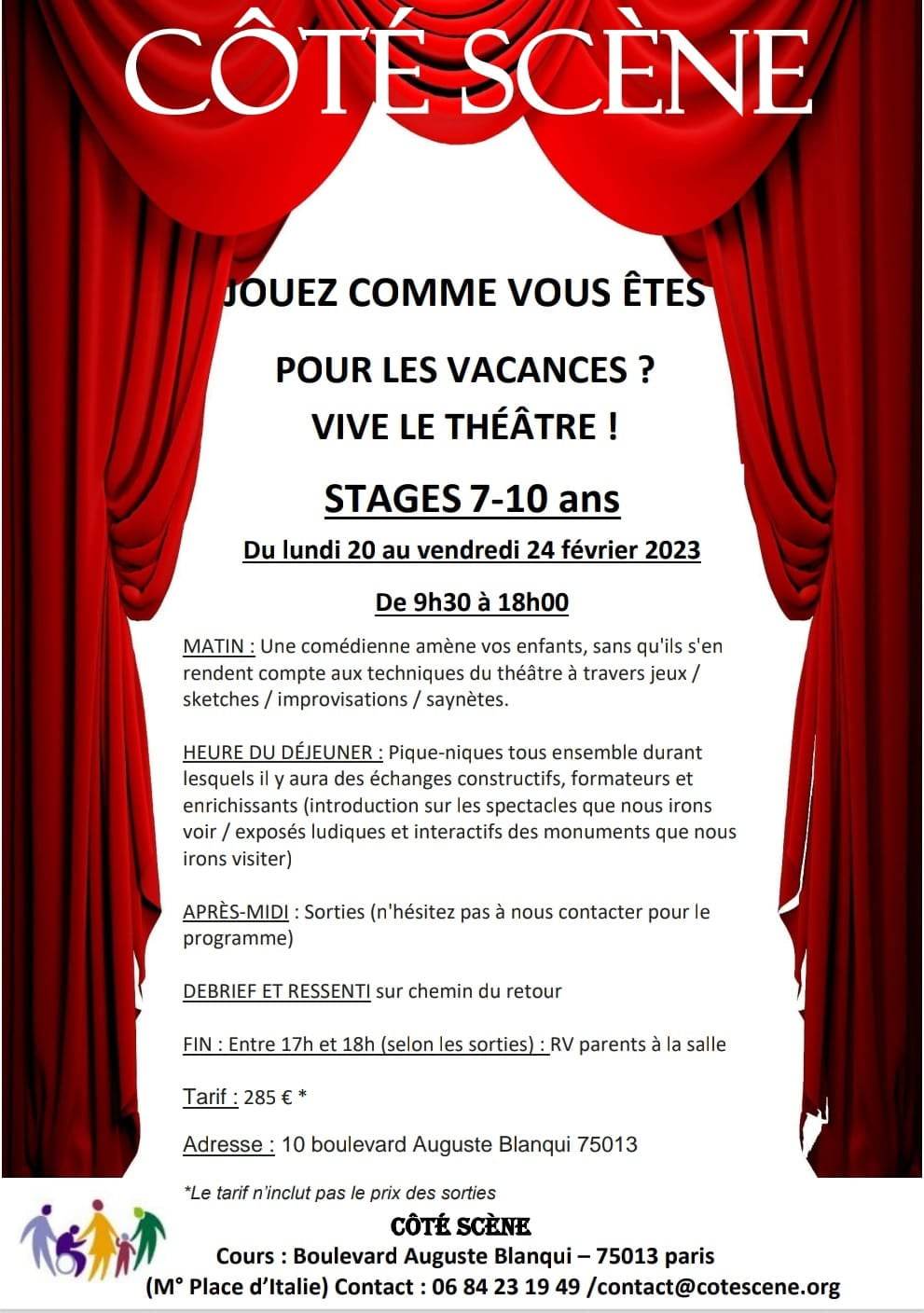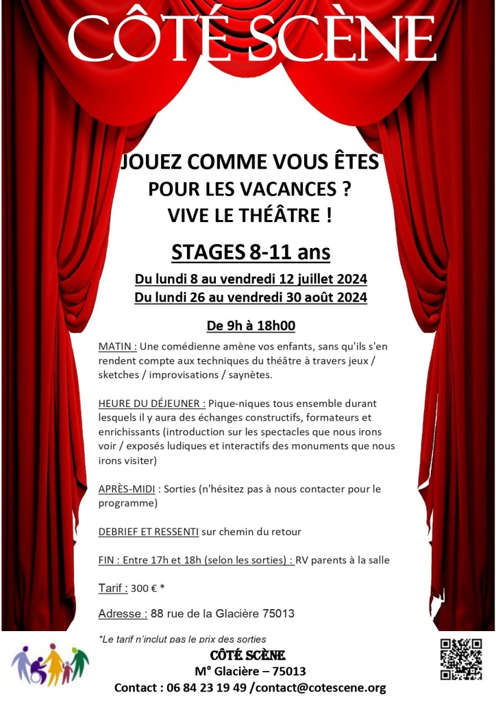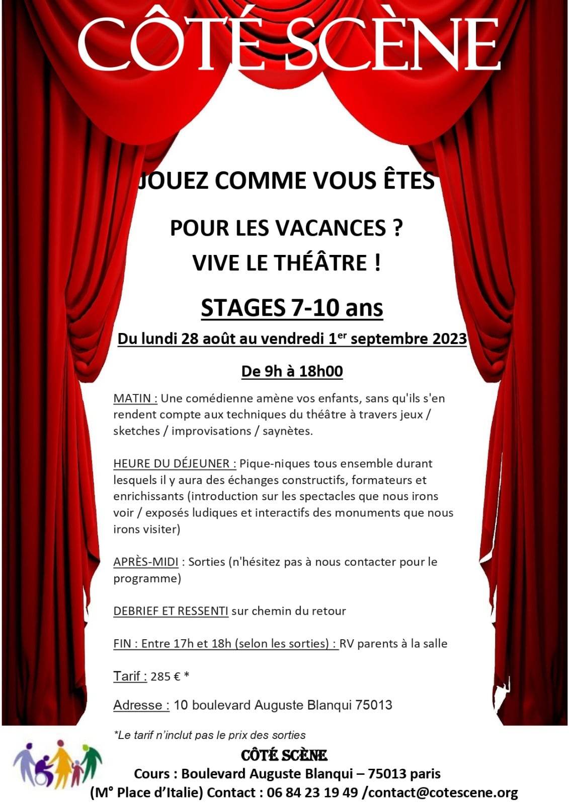 L’école est terminée……vive les vacances qui commencent avec Côté Scène : de la détente, du rire, des jeux d’impros, des découvertes grâce au théâtre , des balades dans Paris pour aller voir des spectacles et découvrir des monuments. La joie des enfants fait le réconfort des parents qui doivent continuer à aller travailler………ou fin août qui doivent reprendre le travail : les enfants n’ont pas envi d’aller au centre de loisirs avant même d’être retournés à l’école…..Côté Scène y a pensé et vous propose un prolongement des vacances pour vos enfants ! N’hésitez pas à nous contacter pour de plus amples renseignements !