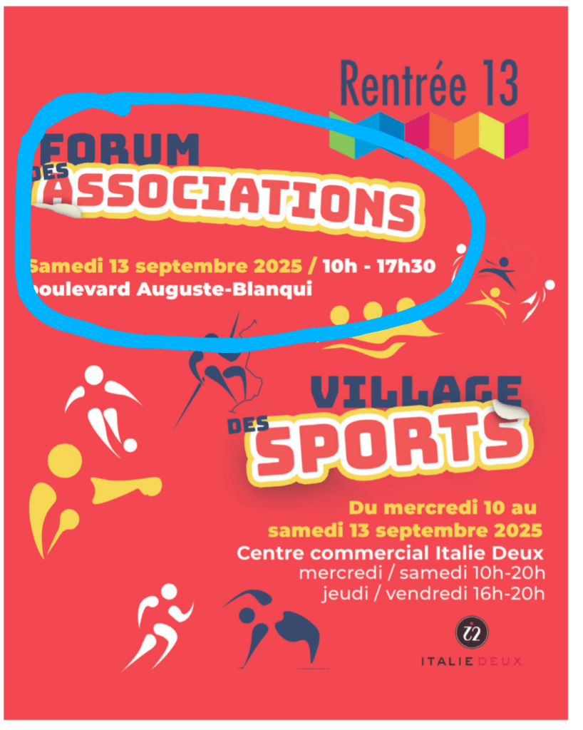 – Samedi 13 septembre 2025 : Rencontre au forum des associations du 13eme de 10h à 17h