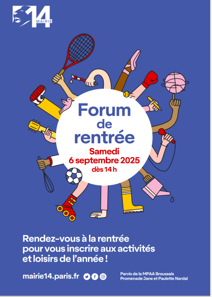 – Samedi 6 septembre 2025 : Rencontre au forum des associations du 14eme arrondissement, de 14h à 18h, sur la Promenade de Jane et Paulette Nadal, 75014.
