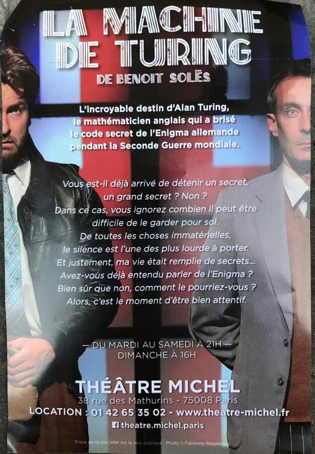 3 mars 2019 : La machine de Turing, de Benoit Solès. Mise en scène de Tristan Petitgirard. Au théâtre Michel (75008)